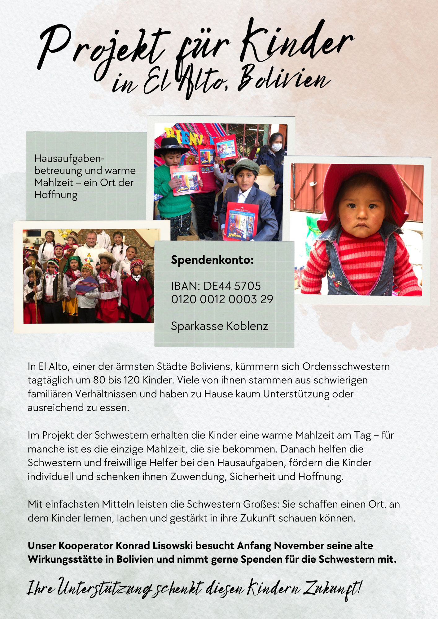 Kooperator Lisowski besucht Anfang November seine alte Wirkungsstätte in Bolivien und nimmt gerne Spenden für die Schwestern mit.