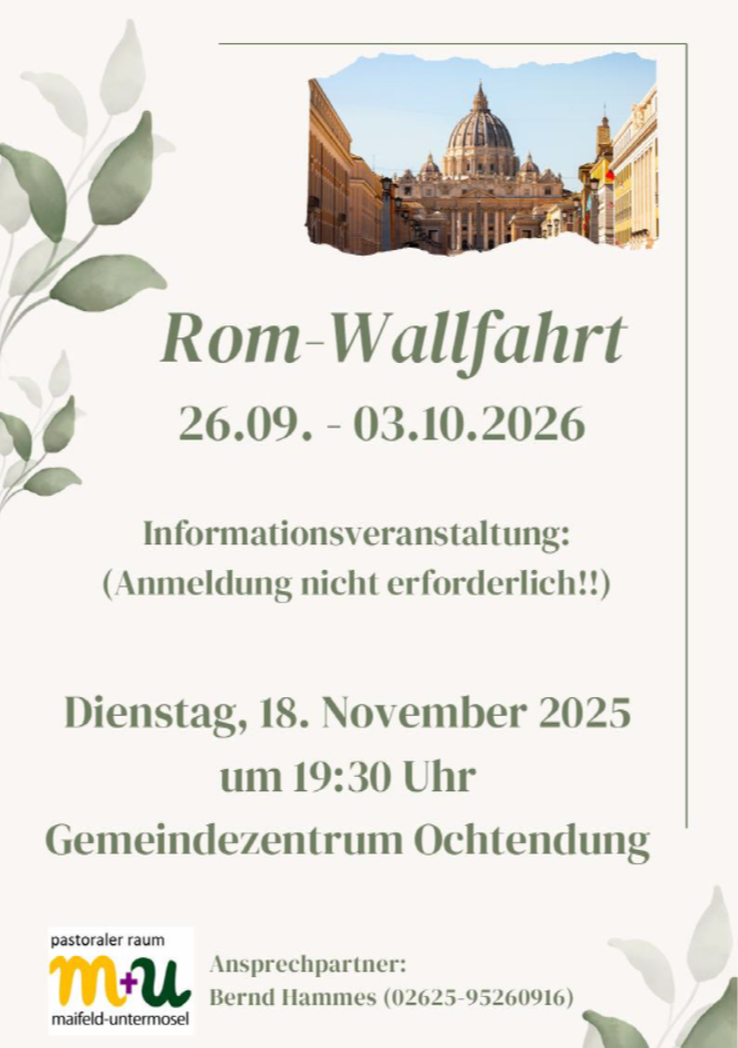 Am Dienstag, 18. November 2025, findet im Gemeindezentrum Ochtendung (Hospitalgasse 10), um 19:30 Uhr, ein Infoabend zur geplanten Rom-Wallfahrt des Pastoralen Raums Maifeld-Untermosel, in 2026 statt. Weitere Infos entnehmen Sie bitte dem Flyer.